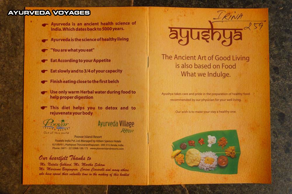 De 90 à 120 mn de soins quotidiens en une session. Consultations aves le Docteur Vishwadan ou le Docteur Vishwadan Dr Ajith Kumar. Il y a 16 therapists et 10 salles de soins. L'Ayurveda Village héberge 18 chambres, mais il est possible de loger dans la partie résidentielle du Poovar Island.